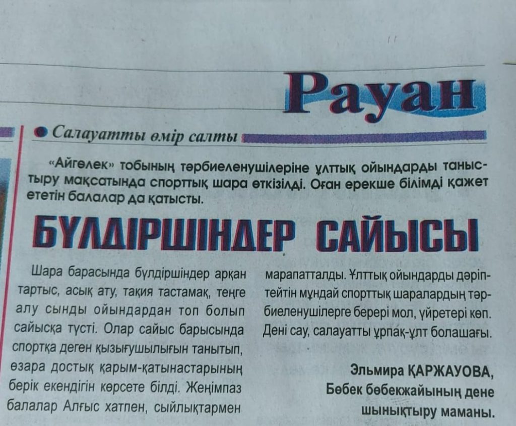 Бөбекжайымыздың, «Айгөлек» тобының тәрбиеленушілеріне ұлттық ойындарды таныстыру мақсатында спорттық шара өткізілді. Спорттық шара дене шынықтыру маманы Қаржауова Эльмира Жолдасбаевнаның Бүлдіршіндер сайысы тақырыбында, рауан қоғамдық-саяси газет беттерінен жарық көрді.