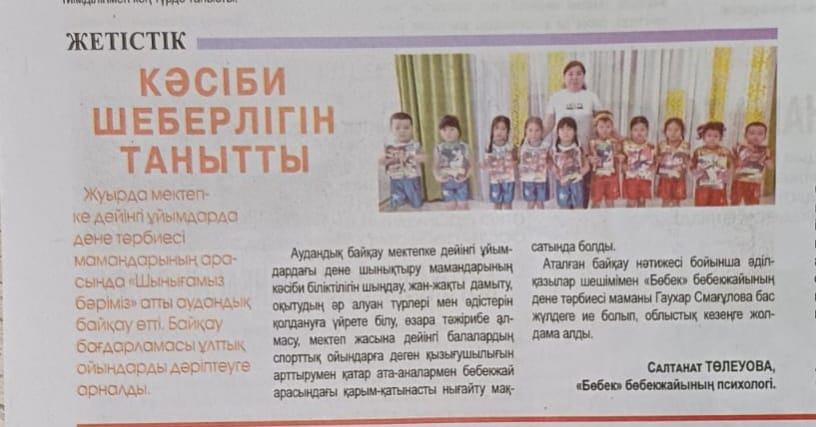 Бөбекжайымыздың психологы Толеуова Салтанат «Кәсіби шеберлігін танытты» атты мақаласы «Рауан» қоғамдық- саяси газет беттерінен жарық көрді. https://www.facebook.com/photo/?fbid=464130382794797&set=a.105606795313826